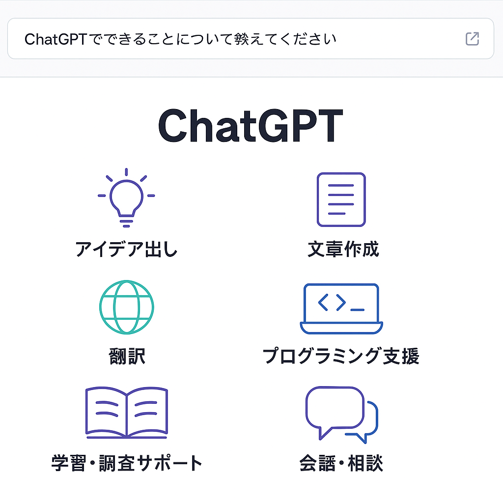 ChatGPTは、テキストベースの生成AIで、アイデア出し・文章作成・翻訳・プログラミング・学習支援など、さまざまな用途に活用できます。
